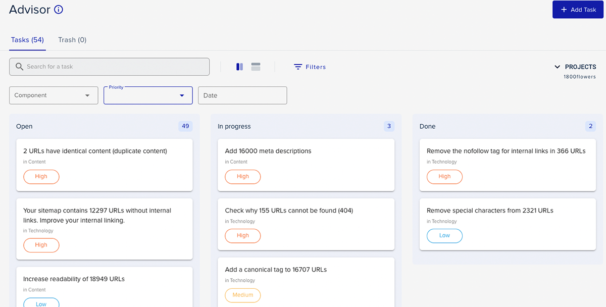 The second reason is that the Advisor is automatically updated based on the results of automated weekly Site Audits. In other words, if a Site Audit identifies any issues concerning a task you completed in the past, it will automatically be updated and pop up in the Open section.